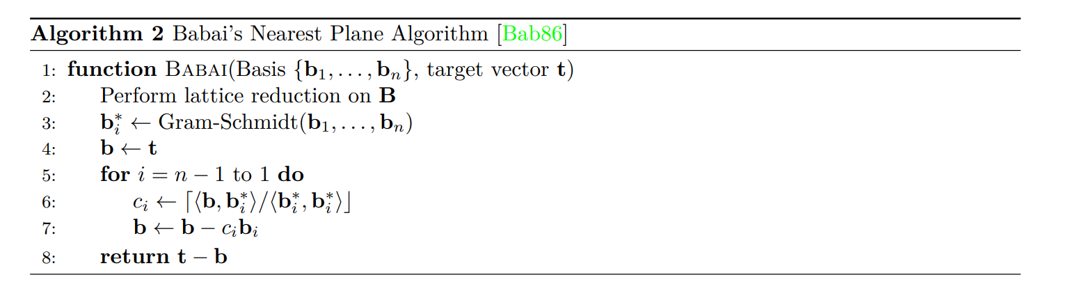 Với tổ hợp tuyến tính thì ta kì vọng sẽ sinh ra một vector ngắn trong lưới đó là . Ta sẽ giải bài toán CVP với target vector là . Sau khi có thì ta sẽ giải tìm lại thỏa mãn .